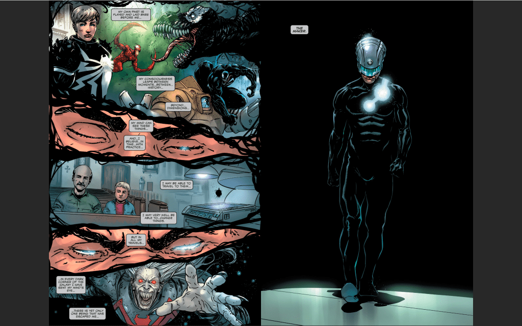 一切都結束了嗎?造物者的意識被歐文分裂成無數碎片,每個碎片在多元宇宙的不同宇宙中重新形成個體,卻共享著同一個意識;這種獨特的存在形態使造物者成為多元宇宙中的巨大威脅。他不僅能跨越宇宙行動,還能利用自己在不同宇宙中的分身進行複雜的戰略部署,試圖實現他的終極目標。在《秘密戰爭》之後,造物者仍有登場,並在多尼凱特 (Donny Cates) 主筆的《黑衣之王》(King in Black) 和《絕對屠殺》(Absolute Carnage) 中參與了與猛毒相關的故事線,並揭露他試著捕獲並研究共生體,藉此來返回終極宇宙,並與里德議會達成了某項協議。