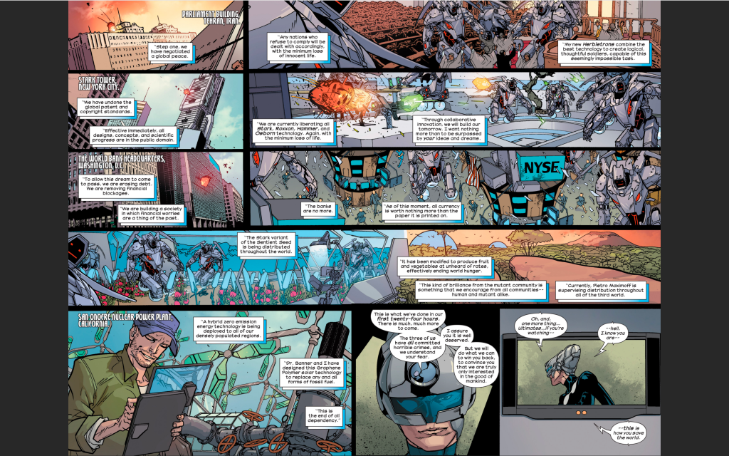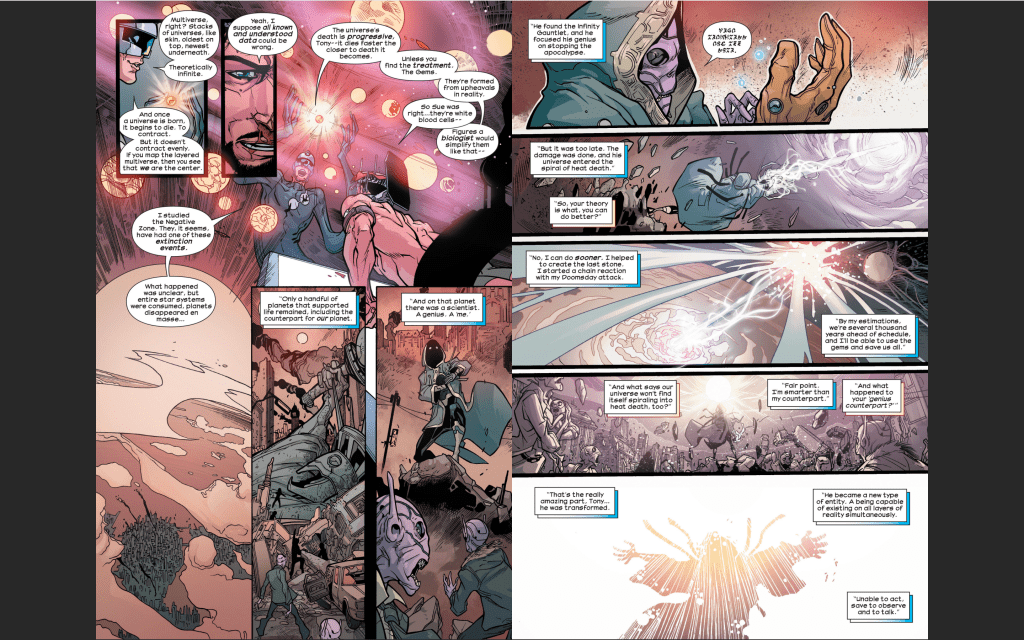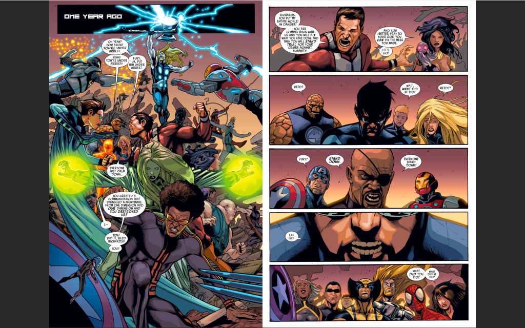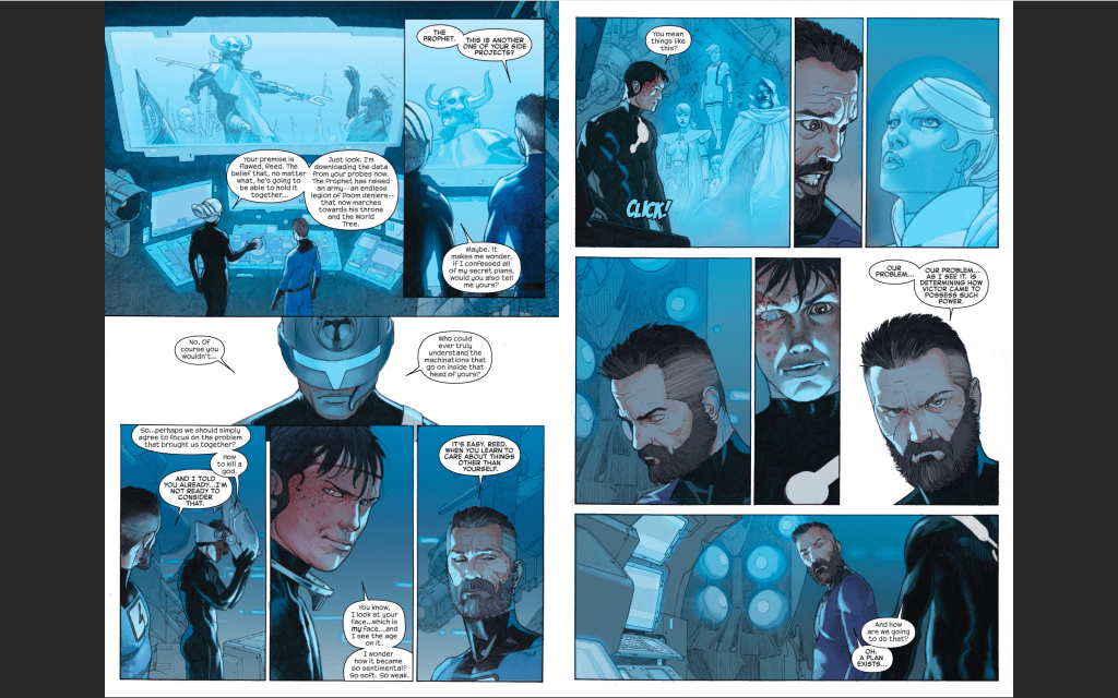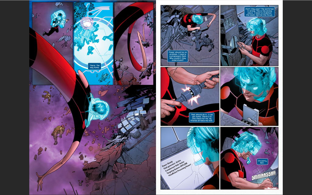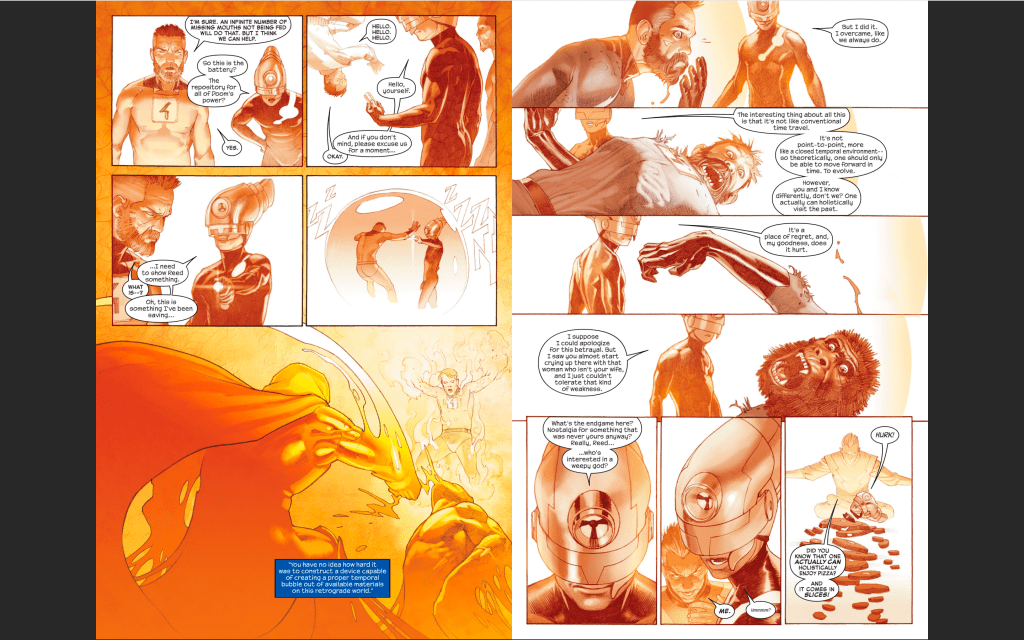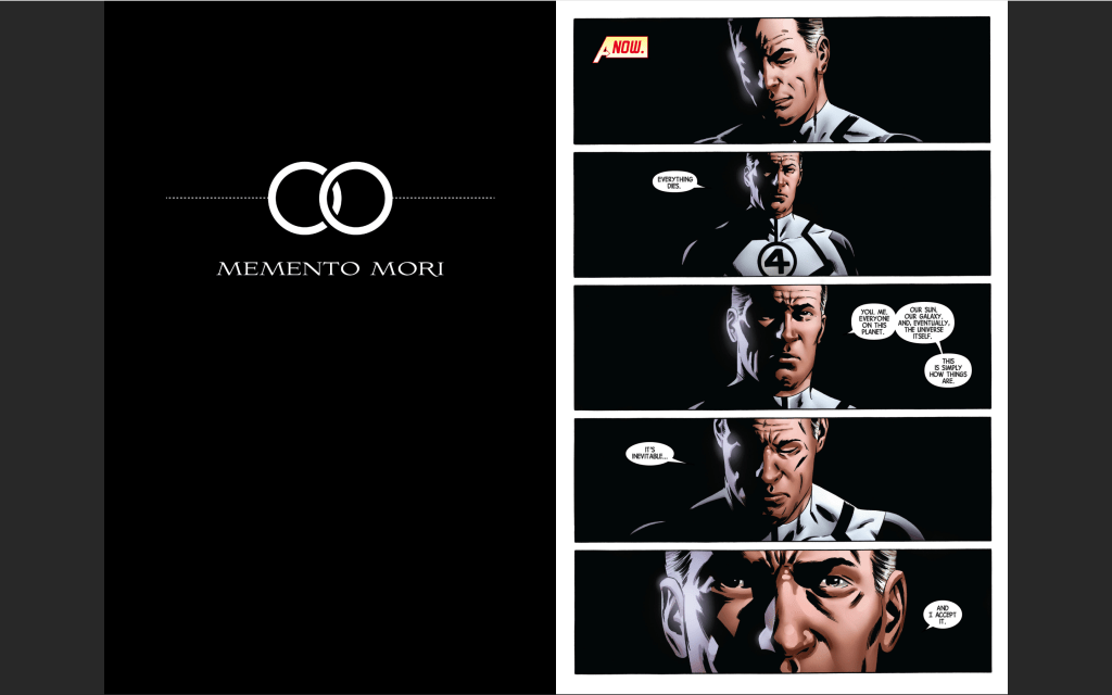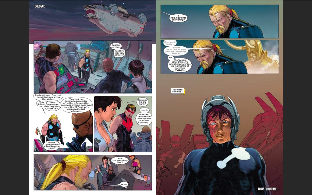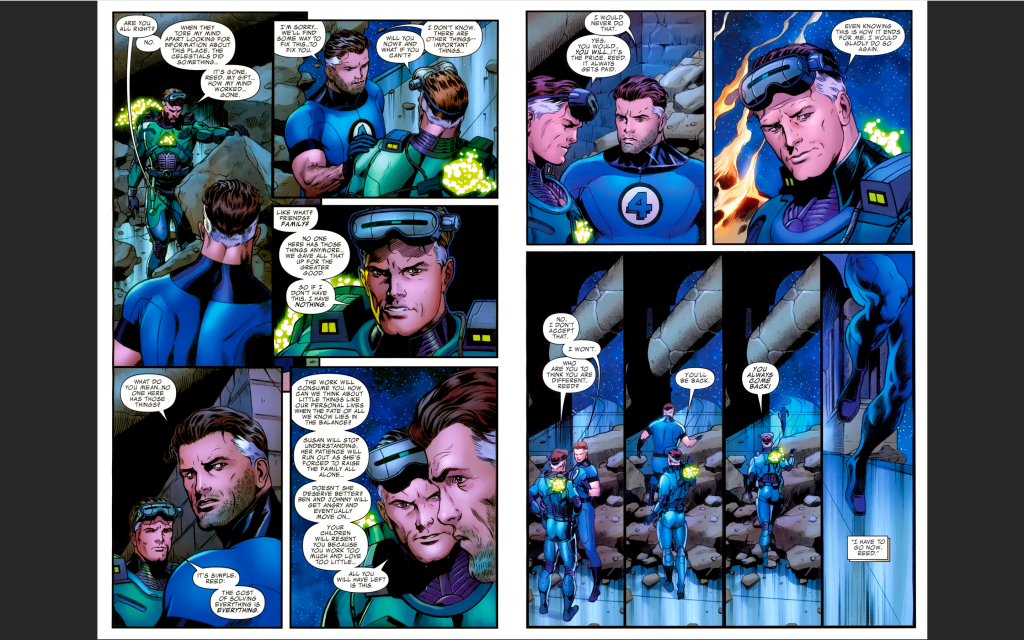 是的,沒有看錯,綜觀漫威幾十年來的出版史,末日博士絕對能算上最強大的反派之一,就這樣莫名被班殺死了,我認為《終極通牒》是終極故事觀系列作品評價下滑的轉捩點,它和其系列作品最大的問題:無意義地賜死太多角色,然後又設計太過複雜的局中局-如果你知道《終極通牒》的結局揭露快銀和緋紅女巫只是假死,前者欲取代萬磁王的地位,會覺得這一切到底在忙什麼?這一連串涉及數個文明存亡的重大事件,因為自責和愧疚、自己的魯莽行為,又沒有及早除掉末日博士而讓他暗中操弄著顛覆世界的計畫,終於把里德逼上了絕路;壓垮他的最後稻草是在《終極通牒》後日譚裡,他向蘇求婚被拒,原因是里德在《終極通牒》選擇拯救世界而不是先拯救她,最終驚奇四超人解散,那個試圖讓世界更好的天才少年消失了,取而代之的是走火入魔、妄想修正萬物的極端改造世界者。