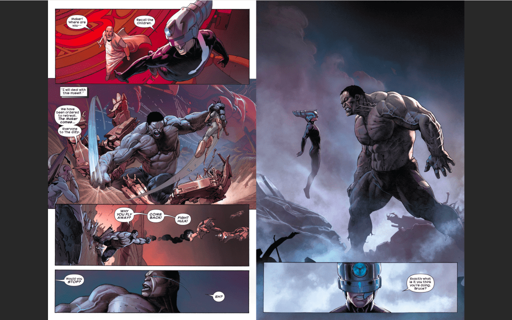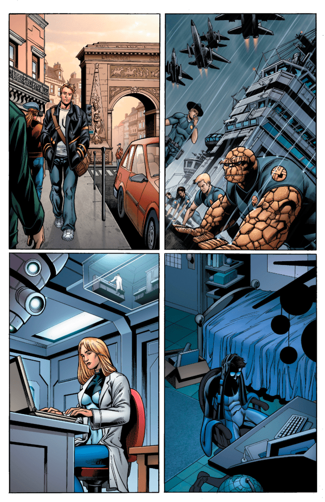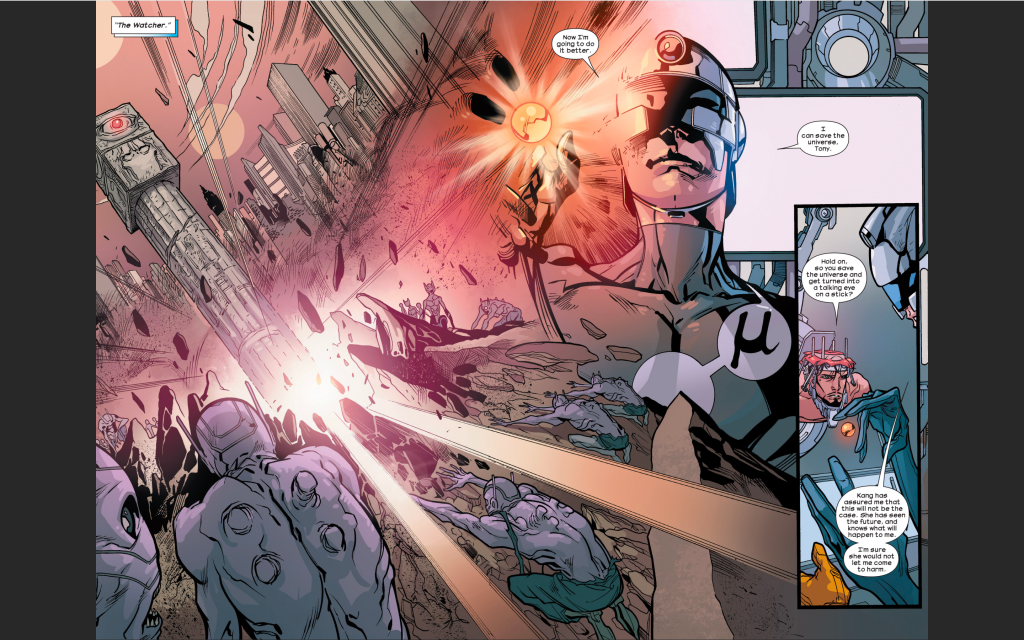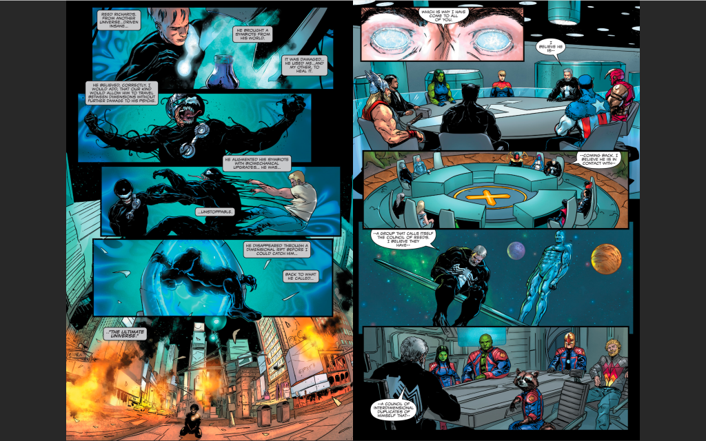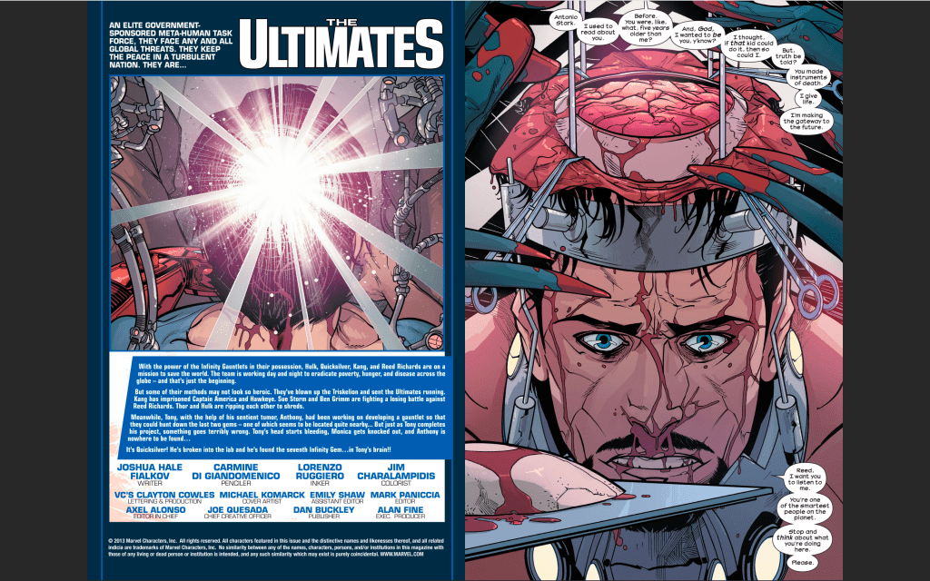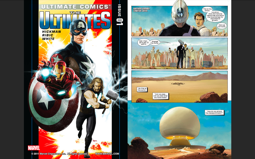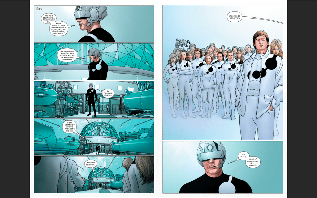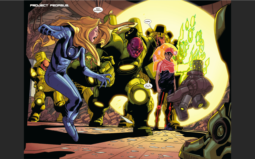 是的,沒有看錯,綜觀漫威幾十年來的出版史,末日博士絕對能算上最強大的反派之一,就這樣莫名被班殺死了,我認為《終極通牒》是終極故事觀系列作品評價下滑的轉捩點,它和其系列作品最大的問題:無意義地賜死太多角色,然後又設計太過複雜的局中局-如果你知道《終極通牒》的結局揭露快銀和緋紅女巫只是假死,前者欲取代萬磁王的地位,會覺得這一切到底在忙什麼?這一連串涉及數個文明存亡的重大事件,因為自責和愧疚、自己的魯莽行為,又沒有及早除掉末日博士而讓他暗中操弄著顛覆世界的計畫,終於把里德逼上了絕路;壓垮他的最後稻草是在《終極通牒》後日譚裡,他向蘇求婚被拒,原因是里德在《終極通牒》選擇拯救世界而不是先拯救她,最終驚奇四超人解散,那個試圖讓世界更好的天才少年消失了,取而代之的是走火入魔、妄想修正萬物的極端改造世界者。