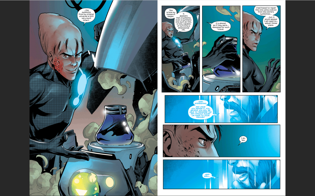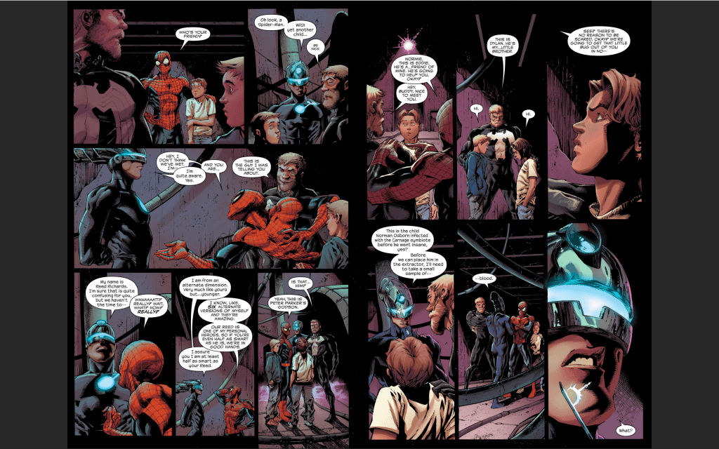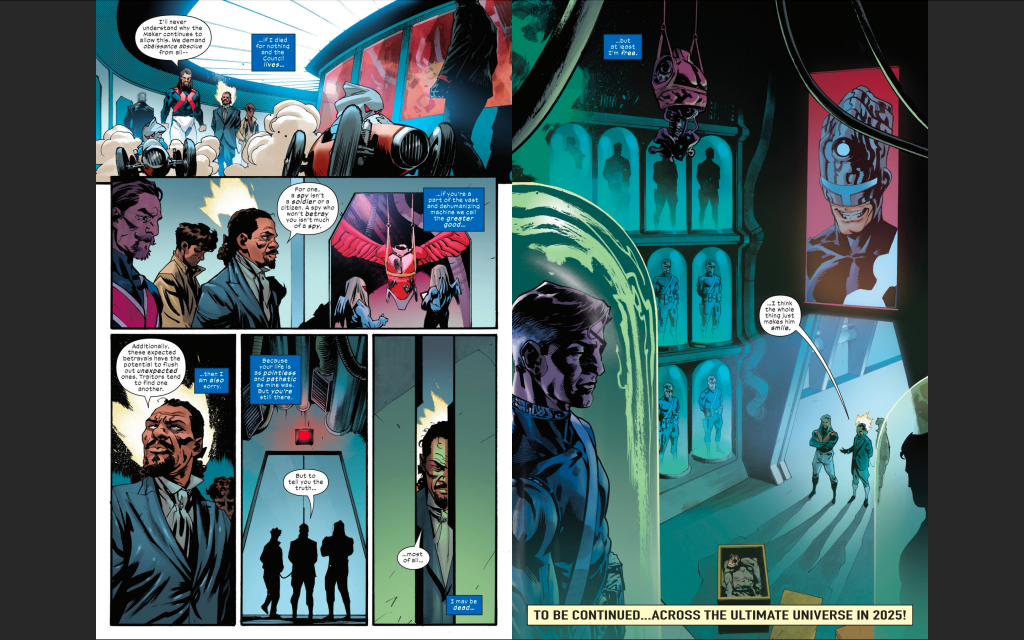 以上就是第 1 話的內容,三位「終極蜘蛛人」橫跨兩個終極宇宙都有其份量。初代終極蜘蛛人彼得帕克一直都是整個終極宇宙 (1610) 最美好的存在,可說是爾虞我詐的終極世界觀最有英雄情操的角色,他的死亡也是造成終極宇宙走向分崩離析的關鍵。二代終極蜘蛛人邁爾斯同樣刻畫飽滿,在後續故事中證明自己是配得上蜘蛛人頭銜的繼承者,更是一位能獨當一面的終極蜘蛛人。我認為里德在成為造物者之前就很欣賞蜘蛛人了,而邁爾斯更是後來唯二與他來到主宇宙的終極宇宙原住民,他和邁爾斯的關係類似於「兄弟」般的緊密;造物者來到 6160 宇宙後,第一件事就是干預該宇宙的彼得帕克成為蜘蛛人一事,還把彼得列為英雄名單中的首位,而東尼也因此把他最精密的裝備交給彼得,也就是那件目前成謎的超強戰衣。