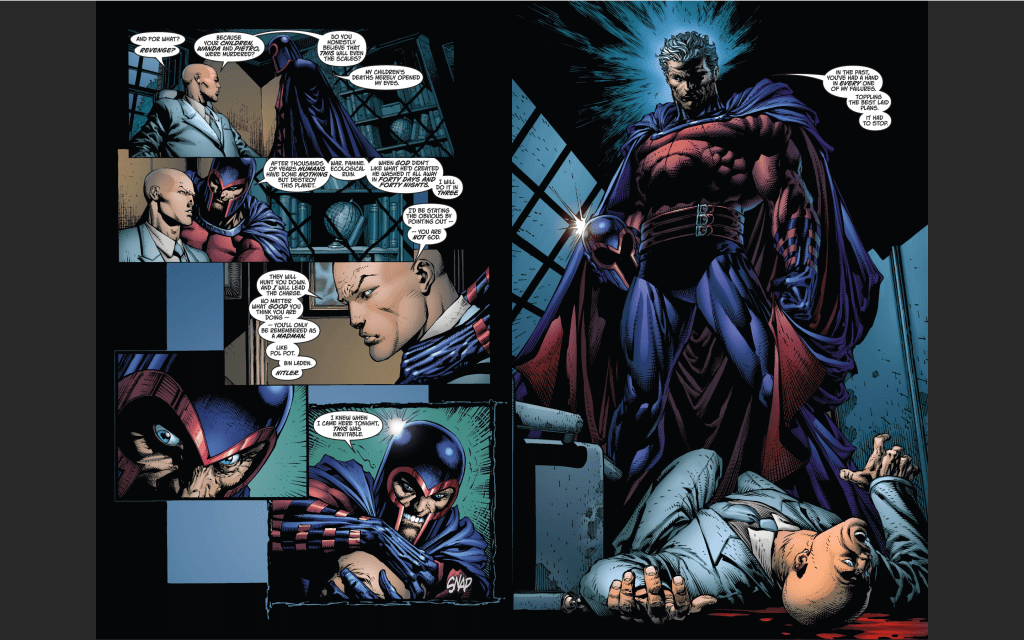 接著在 2009 年的《終極通牒》(Ultimatum) 事件中,終極萬磁王因為一對兒女死去而決定報復世界,他扭轉地球磁場,造成全球性災難。紐約市遭受前所未有的破壞,數以百萬計的人喪生,期間萬磁王還扭斷 X 教授的脖子、操控雷射眼 (Cyclops) 的眼鏡來殺死金鋼狼。故事後期為了阻止萬磁王,尼克福瑞等人揭露了終極宇宙最讓人反感的設定:變種人並不特別,他們並非超越人類的進化物種,而是美國政府因為超人類軍備競賽而製造出來的人造品;萬磁王幡然悔悟、後悔莫及,在修正地球磁極後被雷射眼處死。