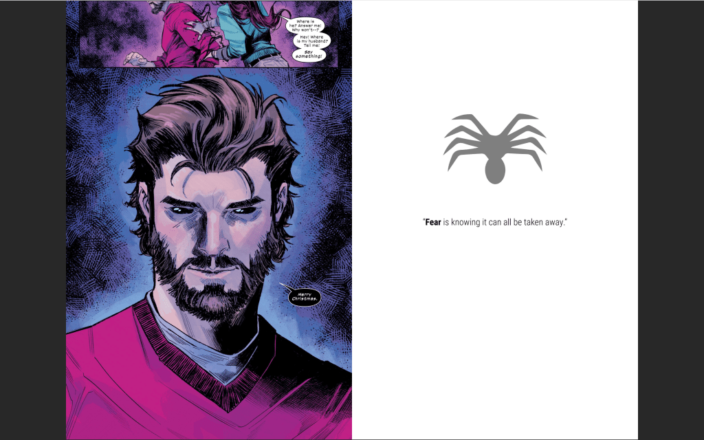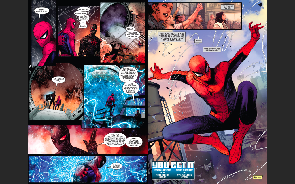 這部《終極蜘蛛人》的美術超級好看,畢竟切凱托畫功沒話説,他筆下的人物各個男帥女美,而且女主角的眼線都很深,可參考他與奇普茲達爾斯基 (Chip Zdarsky) 合作的《夜魔俠》,把艾麗崔也畫得很美,分鏡又強,閱讀起來相當舒服;而希克曼寫的劇情更是一絕,既有一小群人反抗整個龐大社會、努力揭開真相的部分,也有角色間的理念衝突,以及長篇敘事的鋪陳,包括邪惡六人組某些角色的立場尚不明朗,以及共生體似乎出現,這些都是希克曼的拿手好戲,尤其是最新的聖誕節劇情出現了驚人展開,我甚至覺得光是最後一頁的張力就超過整部《獵人克萊文》電影。