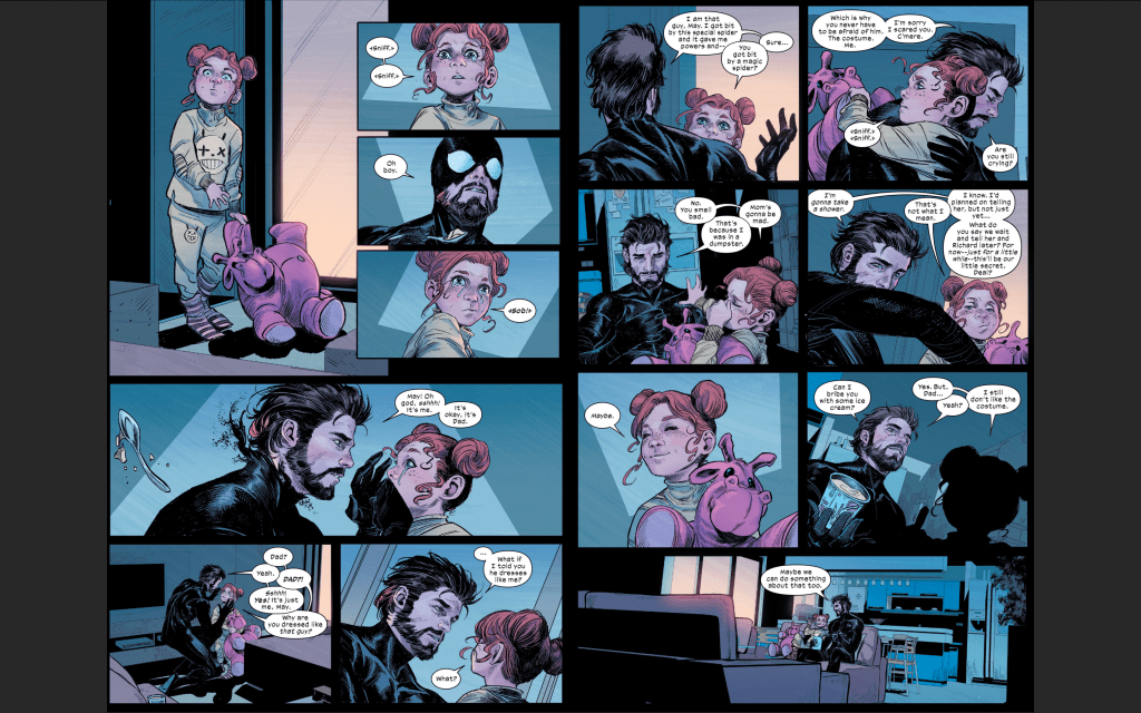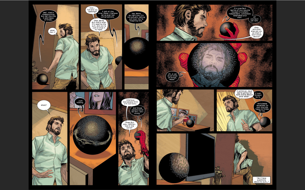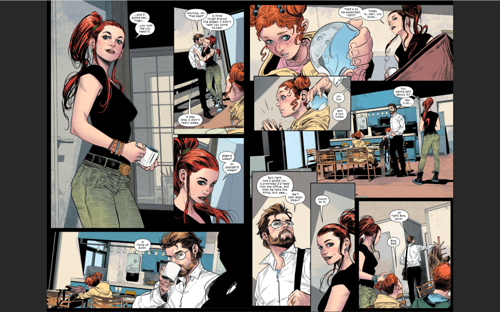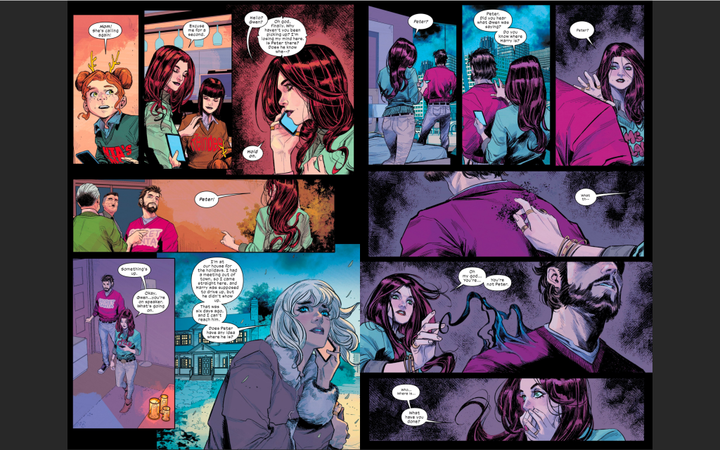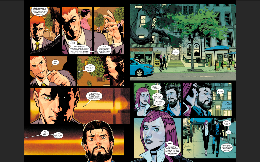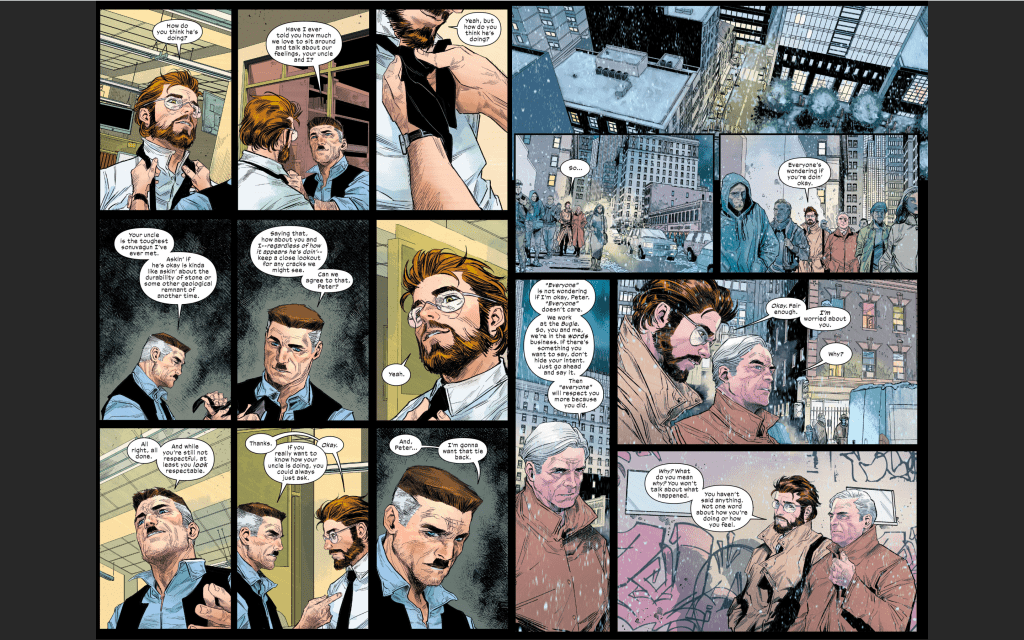 《終極蜘蛛人》的首年連載著重描繪這位中年彼得在成為超級英雄後的生活轉變,特別是他如何在家庭責任與英雄使命之間取得平衡。這個過程並非一人獨行:女兒梅在第 2 話就發現父親的祕密身份,到了第 6 話,妻子瑪莉珍與兒子理查也加入了這個「家族事業」,而近期劇情中,連班叔也察覺到了彼得的雙重身份。這種全家總動員的設定讓整個故事更添溫度,很有希克曼過往作品《驚奇四超人》的韻味,儘管這也意味著彼得需要承擔更多讓家人陷入危險的風險。