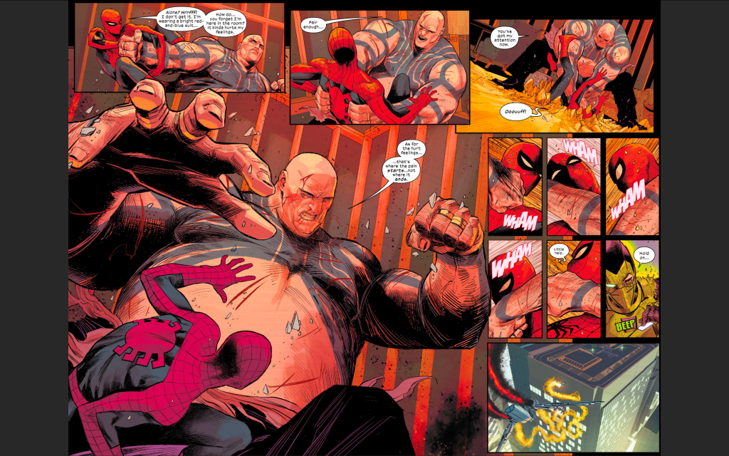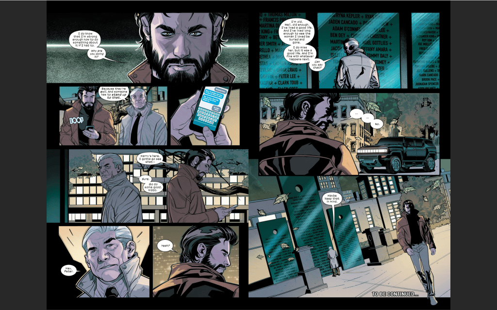 除了主線劇情相關的《終極戰隊》外,個別角色的刊物還有《終極蜘蛛人》、《終極黑豹》、《終極 X 戰警》,以及 2025 年一月要推出的新刊《終極金鋼狼》。不同於一般人對於美漫那龐大的世界線且難以入門的想法,新終極宇宙主打的就是全新故事,看似是熟悉的角色、但卻有新的起源故事,也不用搞清楚過去 80 年美漫發生什麼大事件,是很適合新讀者入門的新系列。我最推薦的莫過於《終極蜘蛛人》,這是希克曼親自執筆、馬可切凱托 (Marco Checchetto) 擔當繪師的全新蜘蛛人故事(巧的是他們兩人在 2022 年 8 月慶祝蜘蛛人登場 60 週年的短篇中有合作過,那一話非常有希克曼的風格,並藉由不同蜘蛛人之口、了解彼得帕克為何不斷陷入麻煩,結尾的蜘蛛人擺盪的分鏡也重現於《終極蜘蛛人》第六話),這部作品並於今年一月開始連載並逐月更新,迄今剛好滿一年,劇情優秀、畫風精美,是我今年看過的眾多美漫中最推薦的一部。