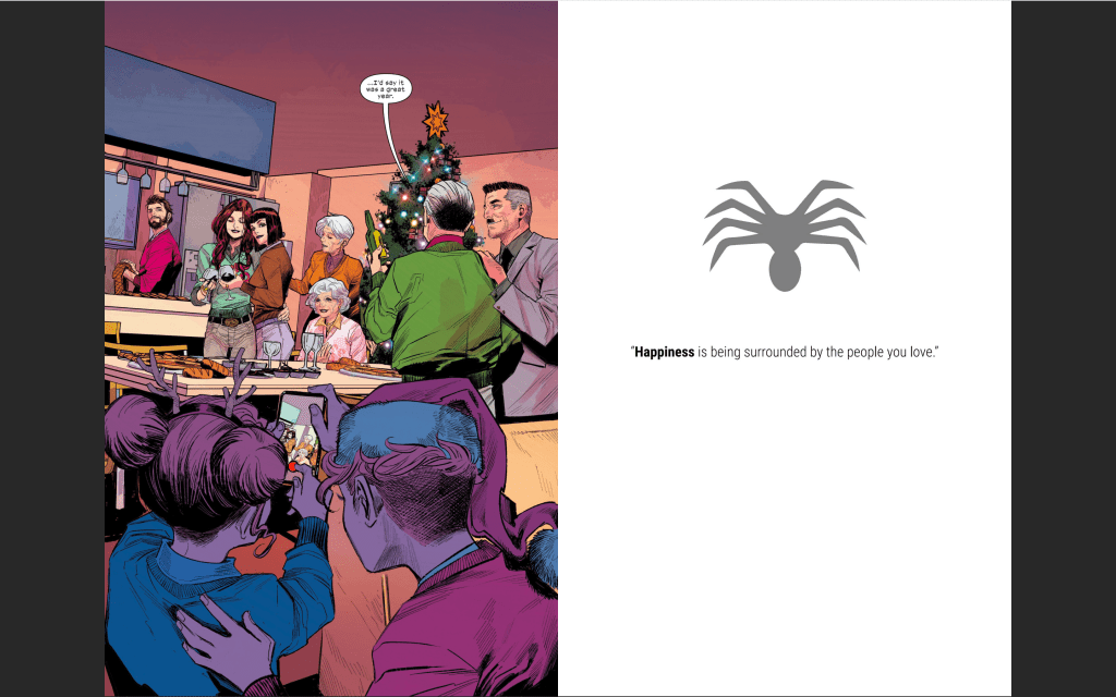 雖然這位中年蜘蛛人見識更豐富,卻還處於英雄生涯的起步階段,他似乎也不像主宇宙的彼得擁有天才級大腦,更像是擁有堅定意志的平凡人,不只要兼顧家庭生活、面對你我凡人都有的煩惱,還得在這個充滿陰謀的世界中找到立足之地。然而,正是這些看似平凡的生活細節,以及家人間真摯的情感互動,讓這部作品散發出一種溫暖而真實的希望之光。
