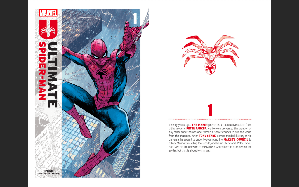 直到 2023 年美漫大神級創作者喬納森希克曼 (Johnson Hickman) 主筆的大事件《終極入侵》(Ultimate Invasion),以及希克曼本人領軍的《終極宇宙》(Ultimate Universe)重啟整個終極世界觀-更準確的說法是新終極宇宙,我才開始每週固定追蹤、閱讀漫畫連載,深入過去數十年的有趣美漫,同時涉獵一些新的系列,例如 X 戰警 (X-MEN) 系列、驚奇四超人 (Fantastic Four) 或復仇者聯盟、緋紅女巫 (Scarlet Witch) 等團隊與個人刊物。而新終極世界觀底下的《終極蜘蛛人》(Ultimate Spider-Man) 就是我今天想分享的主題,既是公認口碑和銷量非常優秀的年度佳作,也是我一整年最喜歡、最推薦的美漫,但在之前必須先了解:什麼是終極世界觀?