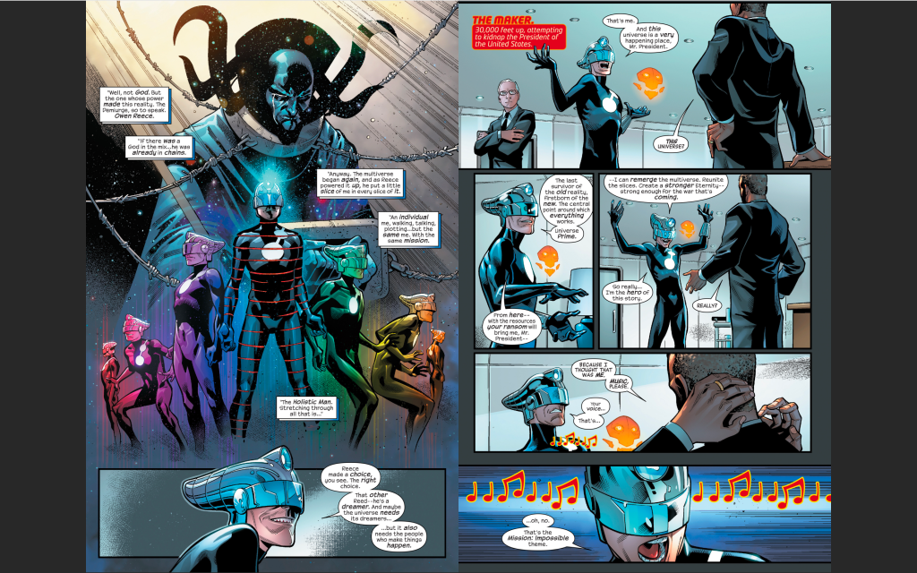 說回終極宇宙,之後還發生主宇宙的銀河王/行星吞噬者 (Galactus),因為《奧創紀元》(Age of Ultron) 導致時空結構破壞而誤闖終極宇宙的 2013 年大事件-《終極災變》(Ultimate Cataclysm),大家熟知的邁爾斯莫拉雷斯和原本被捕的里德被派去主宇宙尋找解決方案,這也是里德第一次知道平行宇宙的自己和蘇有個女兒,如果他做出不同的選擇,一切是否都能走上正軌?里德/造物者的劇情至此告一個段落,他看似洗心革面,但實際上在後續對撞 (Incursion) 事件發生、漫威最大規模的事件《秘密戰爭》(Secret Wars) 2015 前夕,造物者再次活躍,並接下尼克福瑞的委託,前去為世界末日做準備,但實則摧毀了 67 個平行宇宙。果然希克曼才是造物者真正的創造者,他筆下的造物者可說是智力、野心和無情都達到極致,完全展顯出里德理查茲這位全宇宙最聰明之人該有的天才水準,除了有辦法抹除多個平行世界的科技能力外,造物者還能竊取主宇宙里德的末日方舟設計圖後、再自己復刻一艘,並帶著薩諾斯、納摩等人逃亡,要知道主宇宙的方舟是花費不少力氣才建成的,而造物者可以輕易打造出來,以及其他神奇的道具,如抵達雷神軍團的防護罩、最後背叛主宇宙里德時使用的小型時間回溯裝置,這才是「造物」者該有的樣子,而不是想著去解剖終極東尼的大腦的瘋狂科學家。